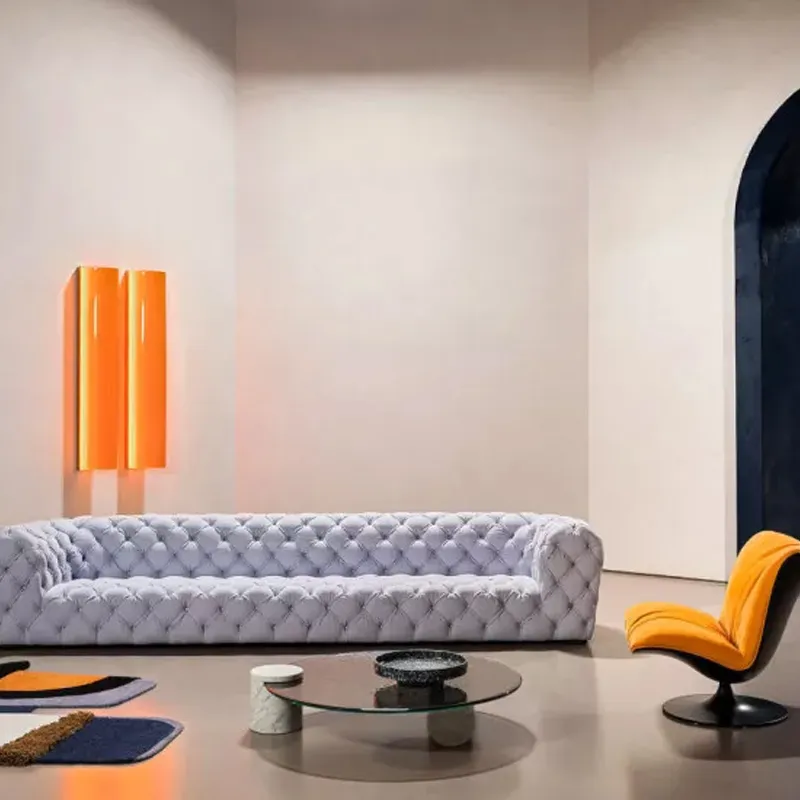 Его очарование заключается в стильной стеганой отделке и закругленном и плавном дизайне. Все эти особенности делают его модным, традиционным и необычным одновременно. Пуговицы и швы, полностью покрывающие его от спинки до ножек, создают великолепные эффекты светотени. Они делают цвета кожи еще более интересными.