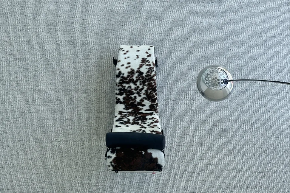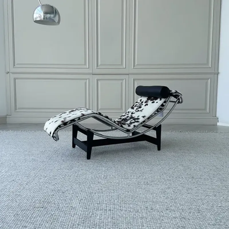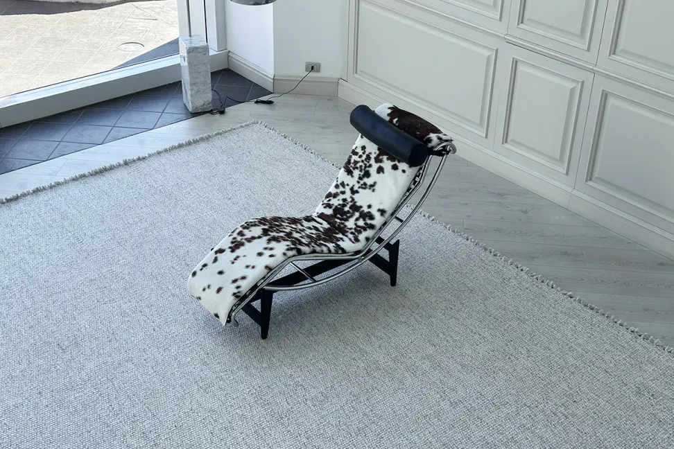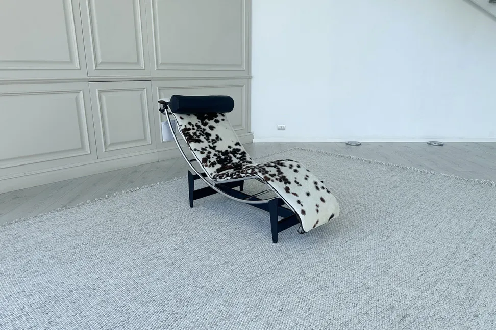 Шезлонг LC4, представленный в нашем салоне, обит кожей пони, материалом с уникальной текстурой, с естественными пятнами белого, черного и коричневого цветов, которые варьируются от гладких до более неровных. Кожа пони также известна своей прочностью, сохраняя при этом роскошный и чувственный вид. Корпус хромированный, а основание черное. В комплект входит съемная подушка для головы из черной кожи.