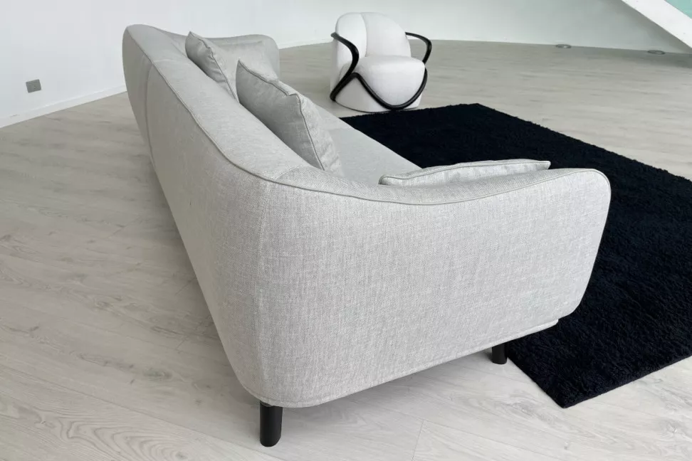 Светло-серая тканевая обивка с соответствующим кожаным профилем цементного цвета. В комплект входят две подушки №2 см.48x29h и №2 см.63x42h из той же ткани, что и диван.