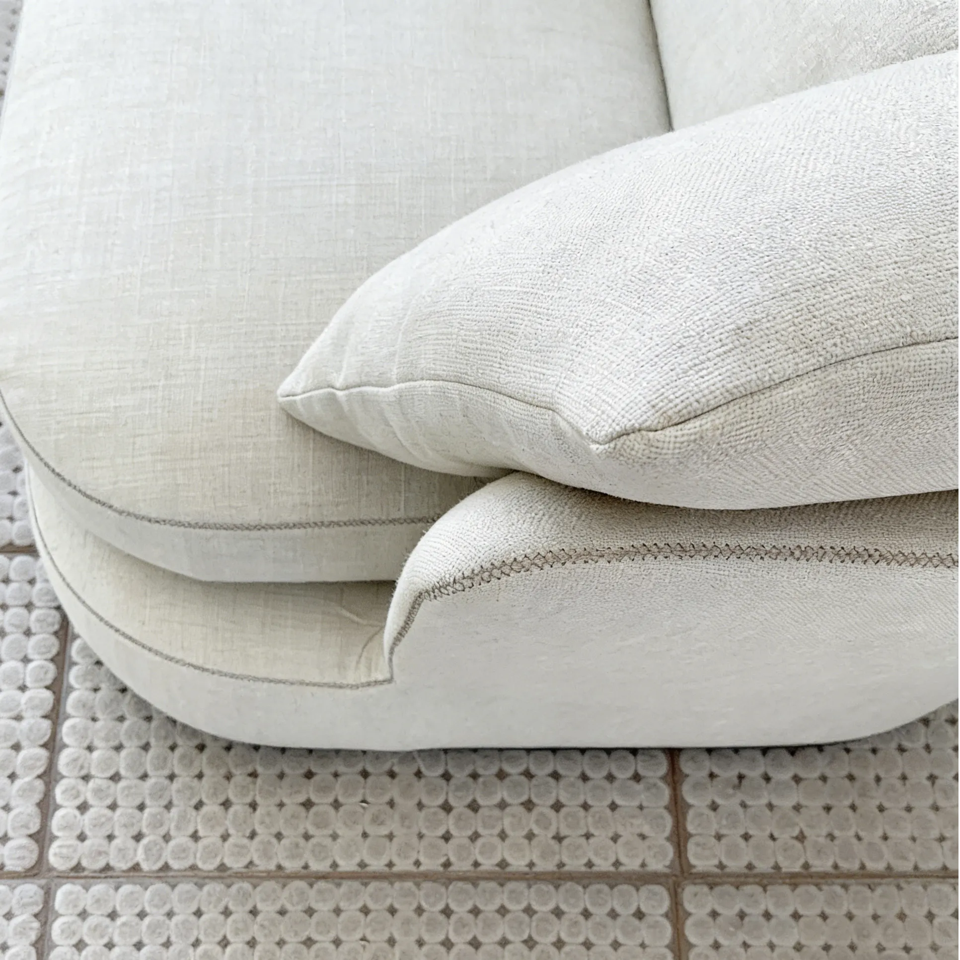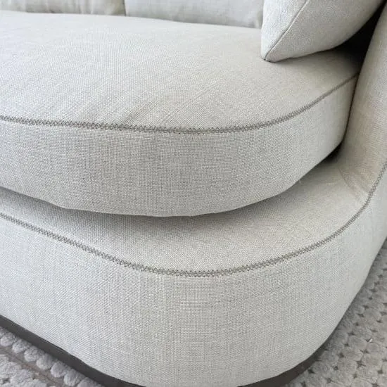 Диван Apollo из предложения Expo в нашем выставочном зале опирается на металлическую основу, окрашенную в янтарный цвет, и имеет обивку из легкой веревочной ткани с тисненой строчкой льняного цвета.