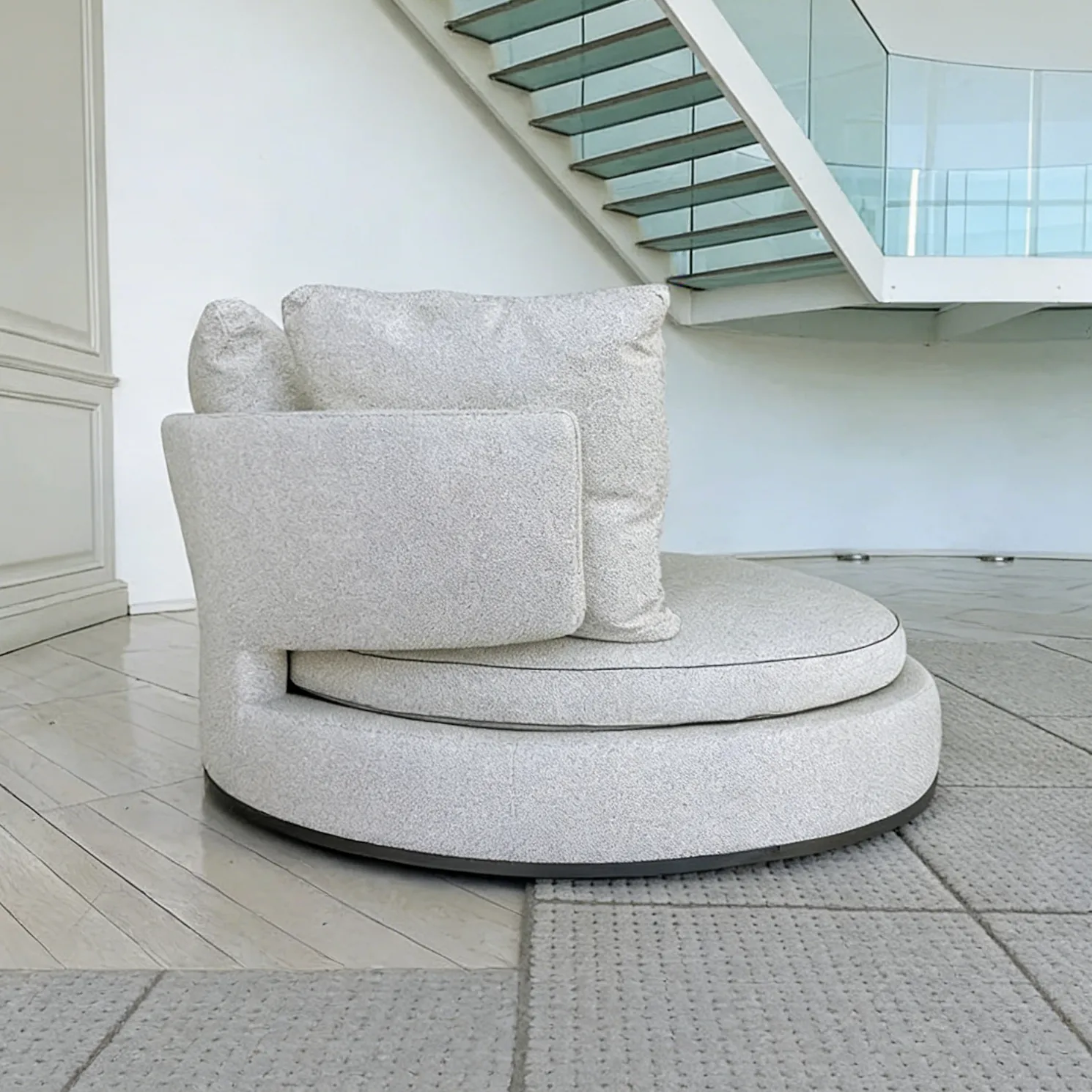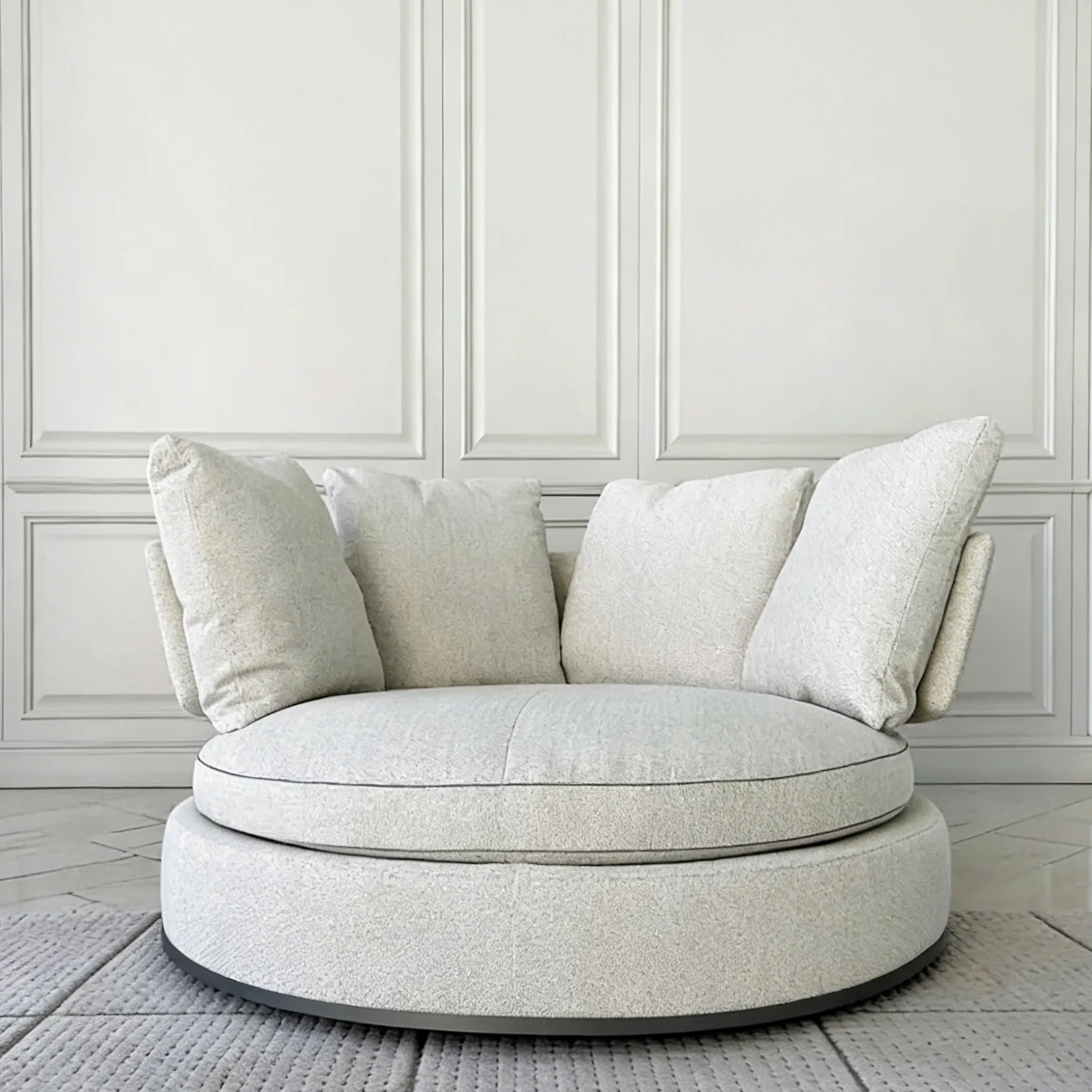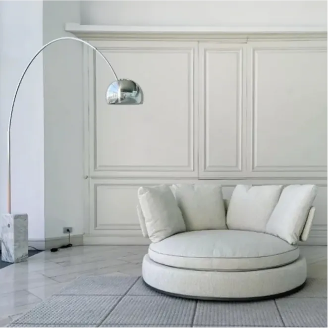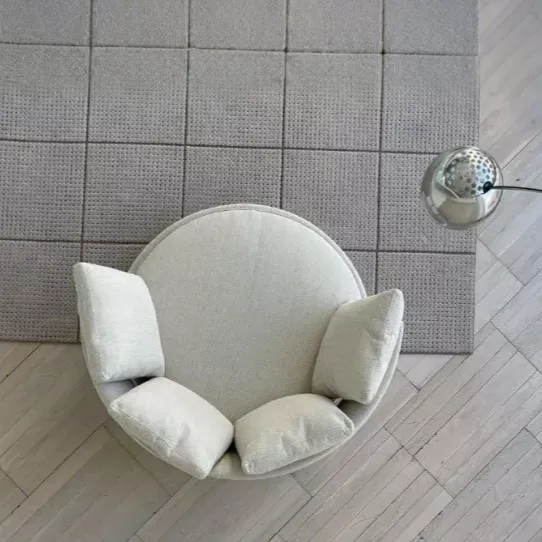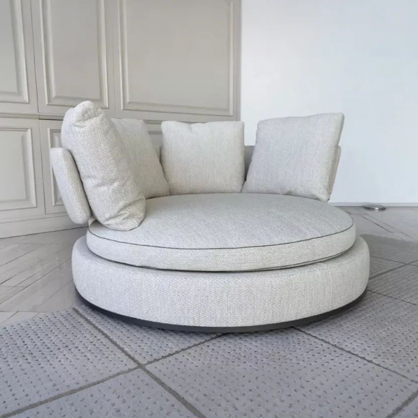 Подушка сиденья опирается на мягкую основу, плавно соединенную с пуховой спинкой. Гармоничные линии этого дивана сочетаются с оригинальностью его круглой формы, что делает его заметным на 360 градусов, в том числе благодаря удобному поворотному основанию.