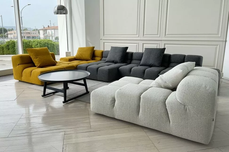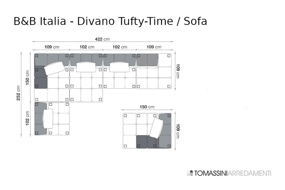 Диван Tufty-Time отличается современным и неформальным дизайном, созданным для максимального комфорта и полной свободы в компоновке многочисленных модулей в соответствии с любыми вкусами и потребностями. Их гибкость позволяет создавать линейные и угловые конфигурации, а также варианты с «полуостровом» или «островом», предлагая индивидуальные решения для любого жилого пространства.