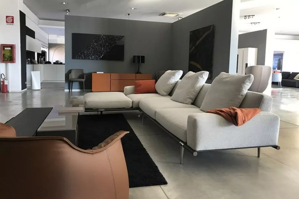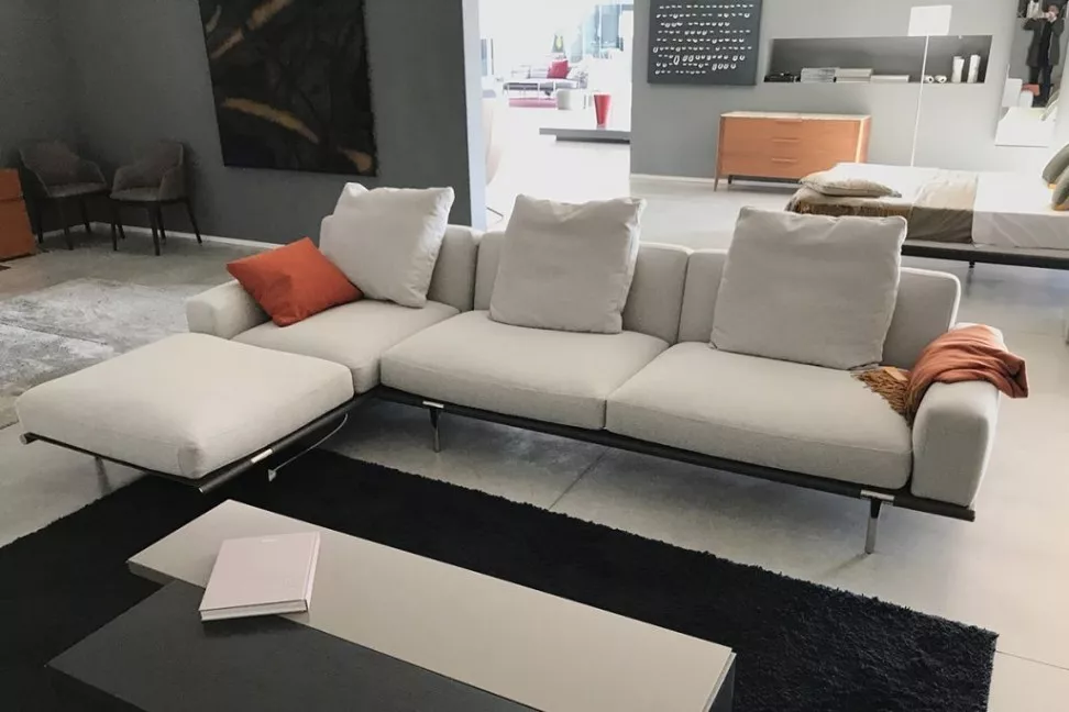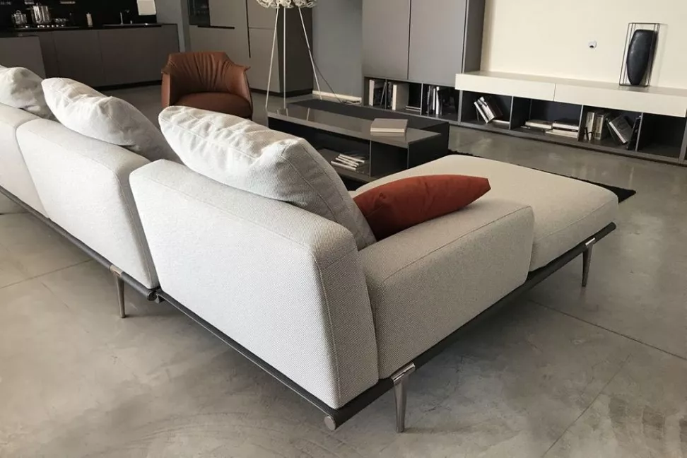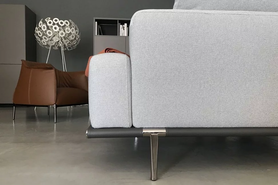 Диван Let It Be отличается алюминиевыми ножками с рутениевой отделкой, основанием из темно-серой кожи и подушками из светло-серой ткани.