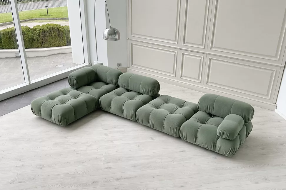 Этот культовый предмет мебели, искусно обновленный, воплощает суть современного дизайна, предлагая беспрецедентное сочетание стиля, функциональности и элегантности. Диван Camaleonda выделяется своей обивкой из зеленой ткани, которая привносит ноту свежести и яркости в окружающий интерьер. Композиция дивана включает в себя левый угловой элемент, центральный элемент, два квадратных пуфа и правый торцевой элемент. Эта конкретная конфигурация представляет собой гармоничное и функциональное решение, позволяющее создать уютную и универсальную зону отдыха в вашей гостиной.