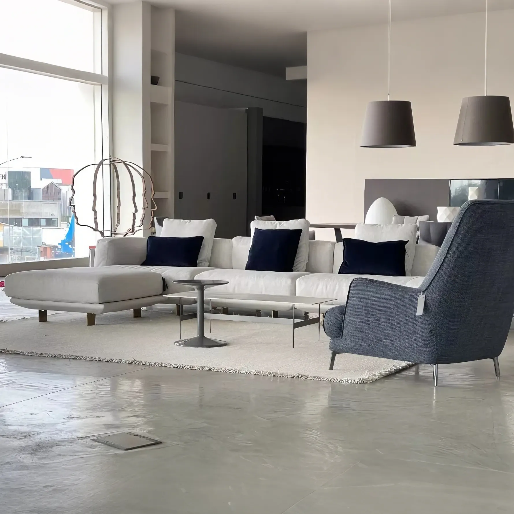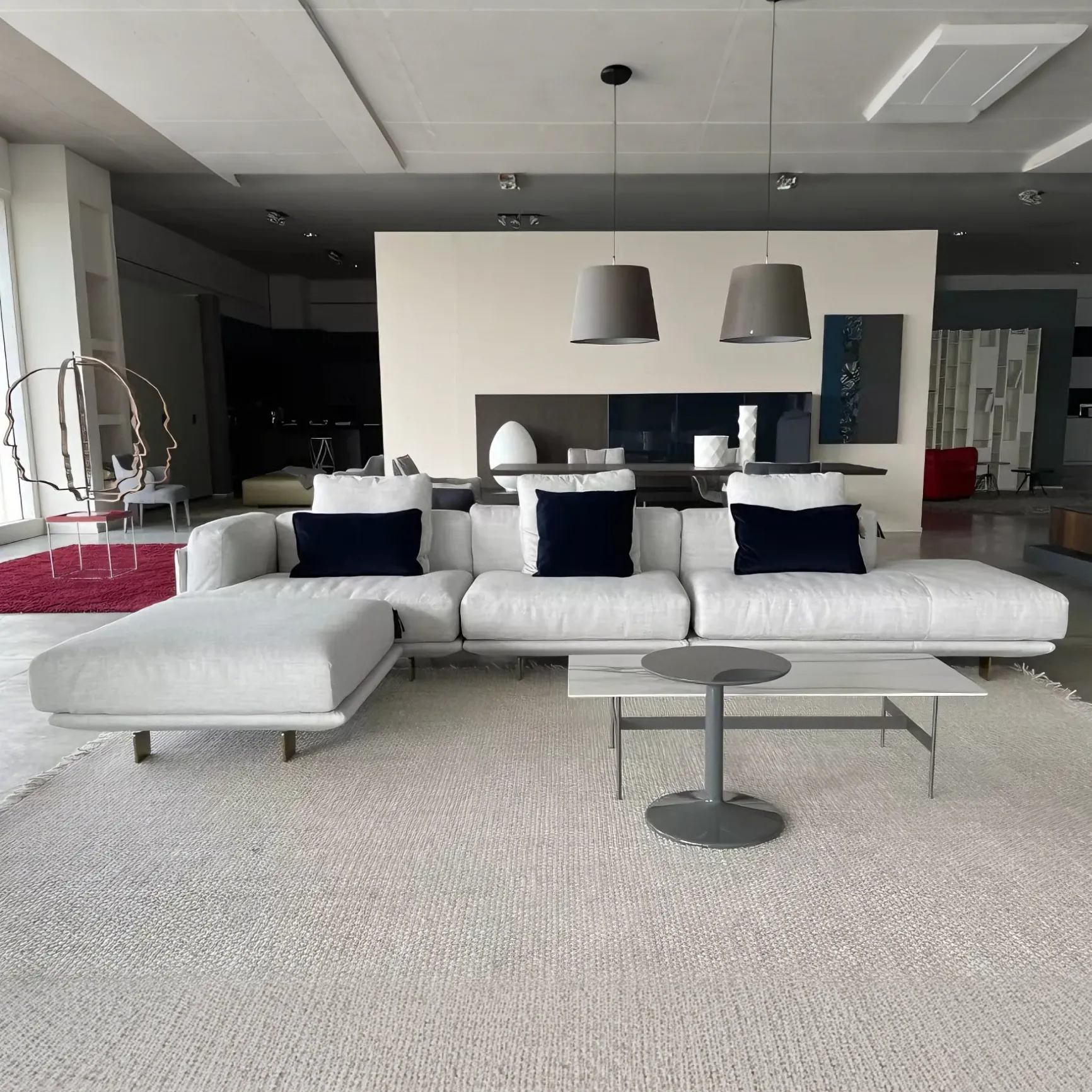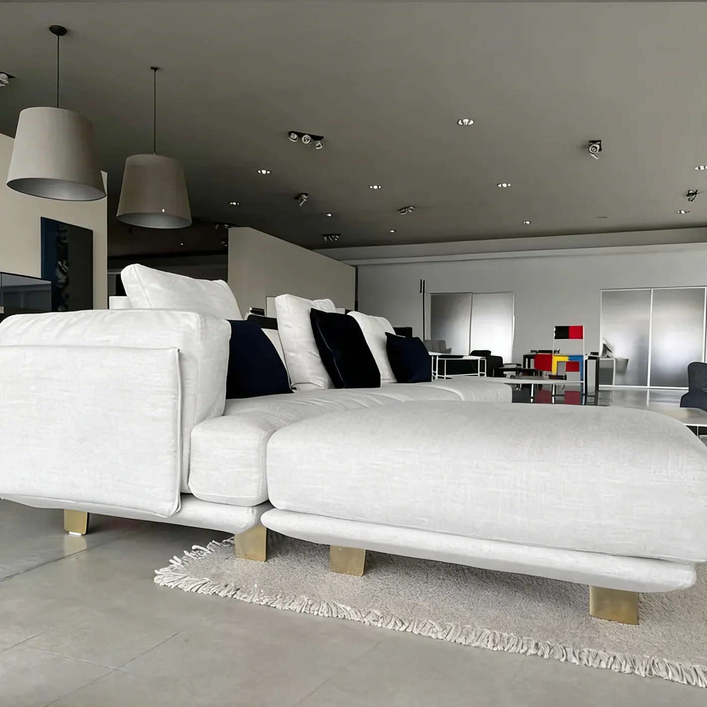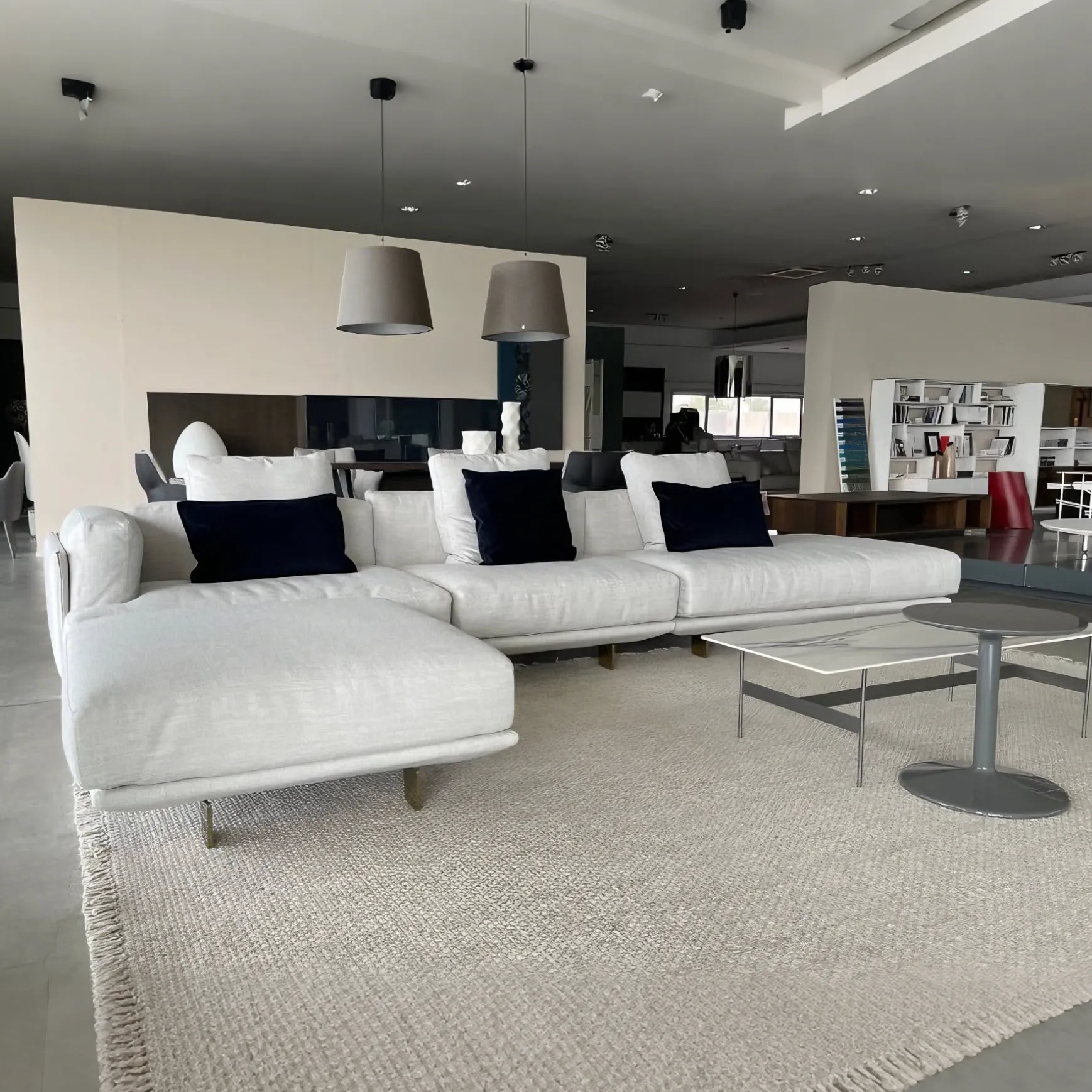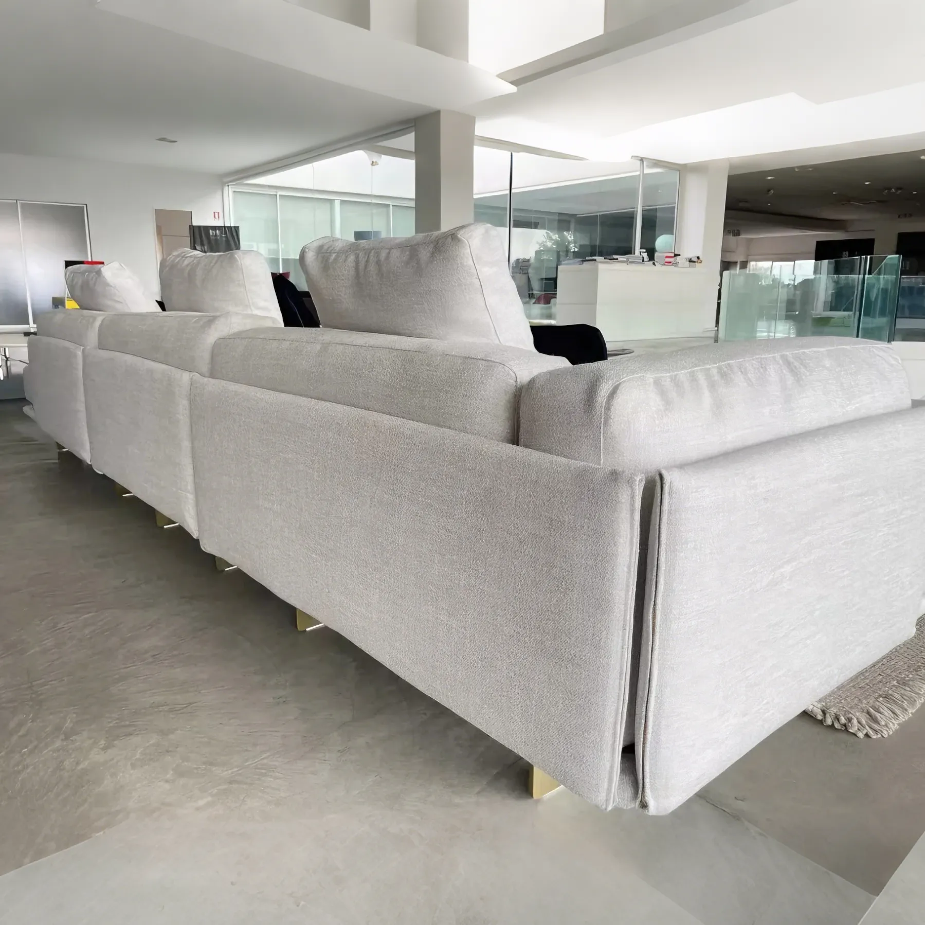 Диван Campus из предложения Expo в нашем выставочном зале имеет светло-серую тканевую обивку и опирается на металлические ножки с отделкой цвета шампанского. Диван дополнен тремя дополнительными подушками, покрытыми синим бархатом.
