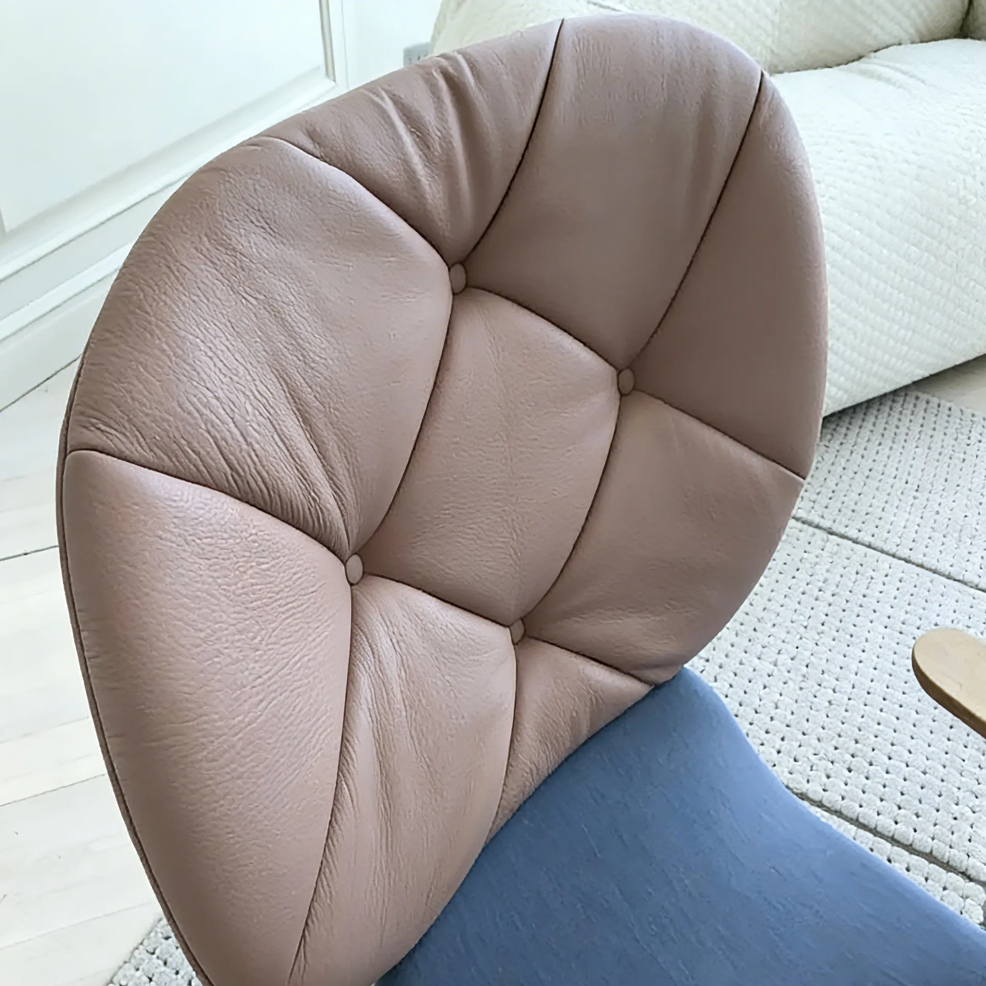 Каркас из дуба, спинка с отделкой капитоне из кожи старинного розового цвета и сиденье из ткани синего джинсового цвета.