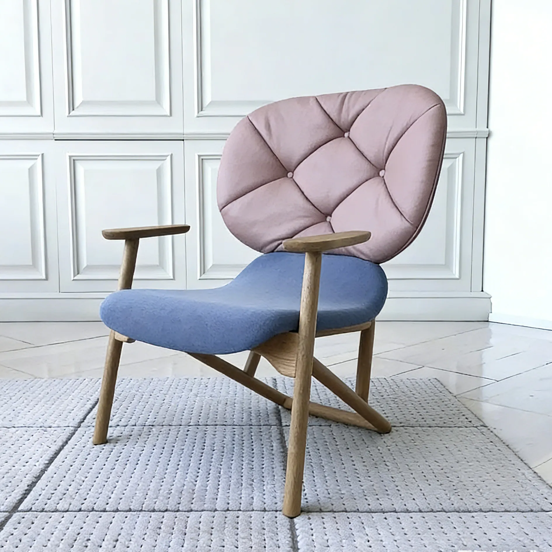 Кресло Klara имеет дубовую конструкцию, спинку со старинной розовой отделкой капитоне и синее джинсовое сиденье.