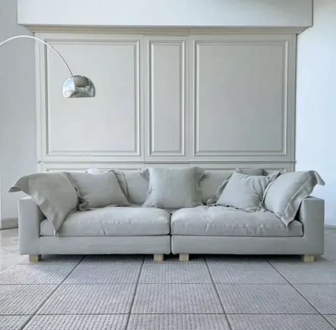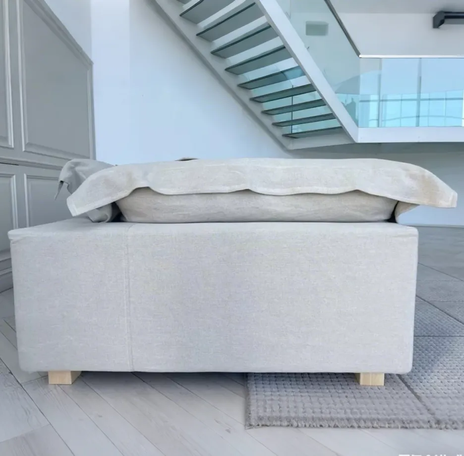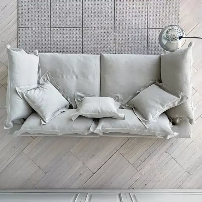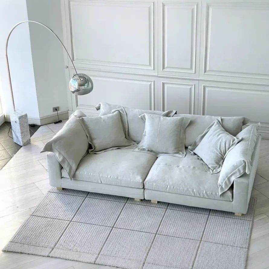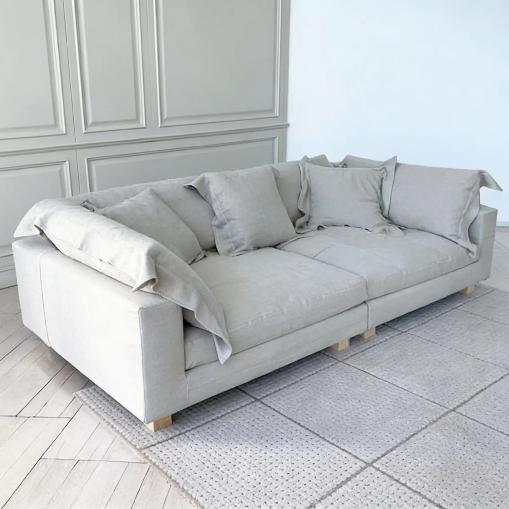 Диван Nebula Nine, похожий на облако, с большими подушками, покрытыми льняным полотном, является идеальным местом, где можно побаловать себя моментом комфорта и расслабления.
