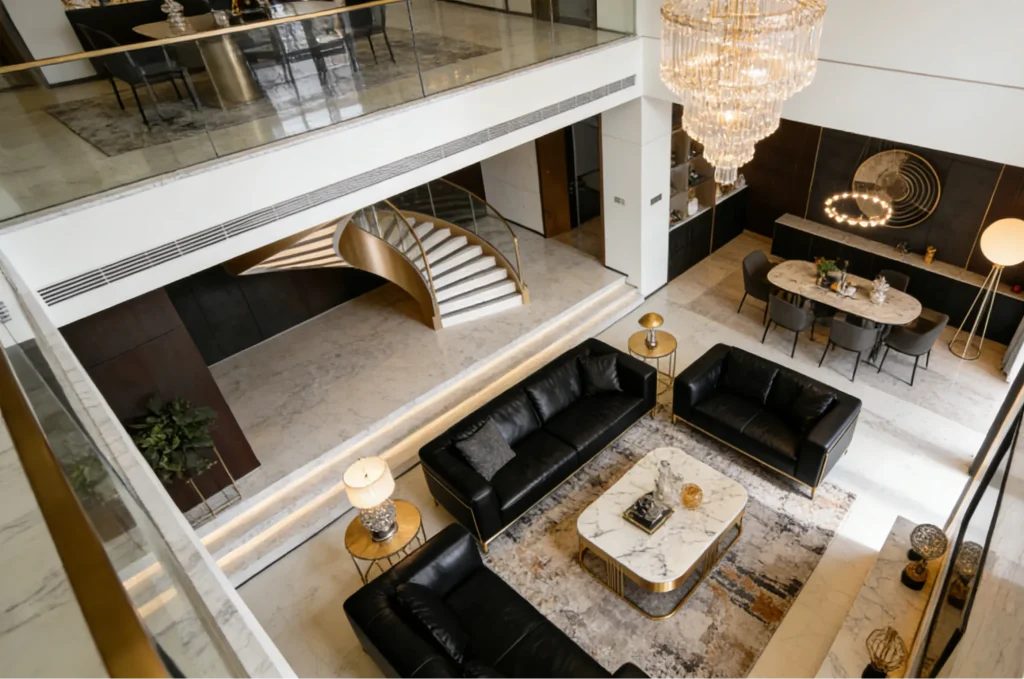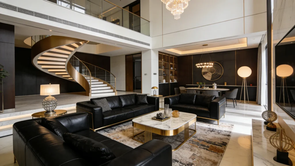 Мы выбрали стилистику «современного ар-деко», используя высококонтрастную палитру из глубокого черного, чистого белого и матового золота. Цель заключалась не просто в заполнении пространства, а в том, чтобы повторить архитектурные линии дома, создавая плавный переход между интерьером помещения и мебелью.