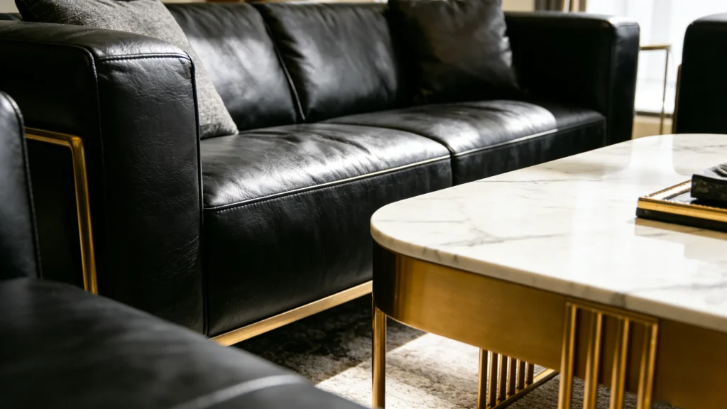 Материалы: Обивка выполнена из премиальной полуанилиновой черной кожи (top-grain), выбранной за ее мягкость и долговечность.